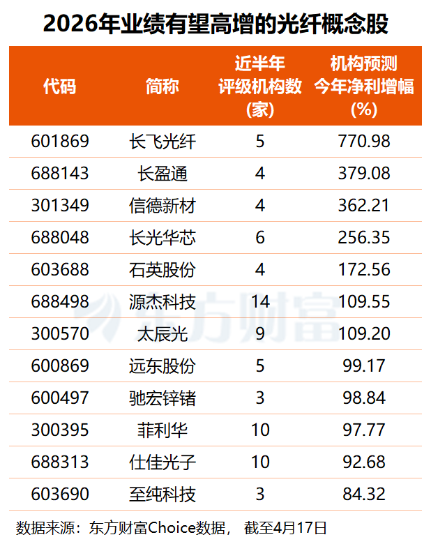 未来增长潜力方面,根据3家及以上机构一致预测,共有7只光纤概念股2026年业绩有望翻倍增长。其中,机构预计长飞光纤今年净利将同比大增7.7倍,长盈通、信德新材、长光华芯预测净利增幅均在2.5倍至3.8倍之间,石英股份、源杰科技、太辰光、菲利华、仕佳光子等7股均有望实现九成以上业绩增长。