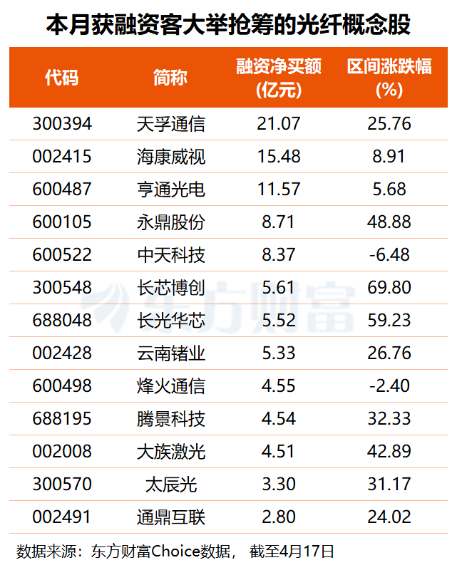资金方面,东方财富Choice数据显示,4月以来,多达25只光纤概念股获得超1亿元杠杆资金加仓,其中,天孚通信、海康威视、亨通光电分别获融资客“扫货”21.07亿、15.48亿、11.57亿元,永鼎股份、中天科技融资净买额均超8亿元,长芯博创、长光华芯、云南锗业亦获超5亿元融资净买入。